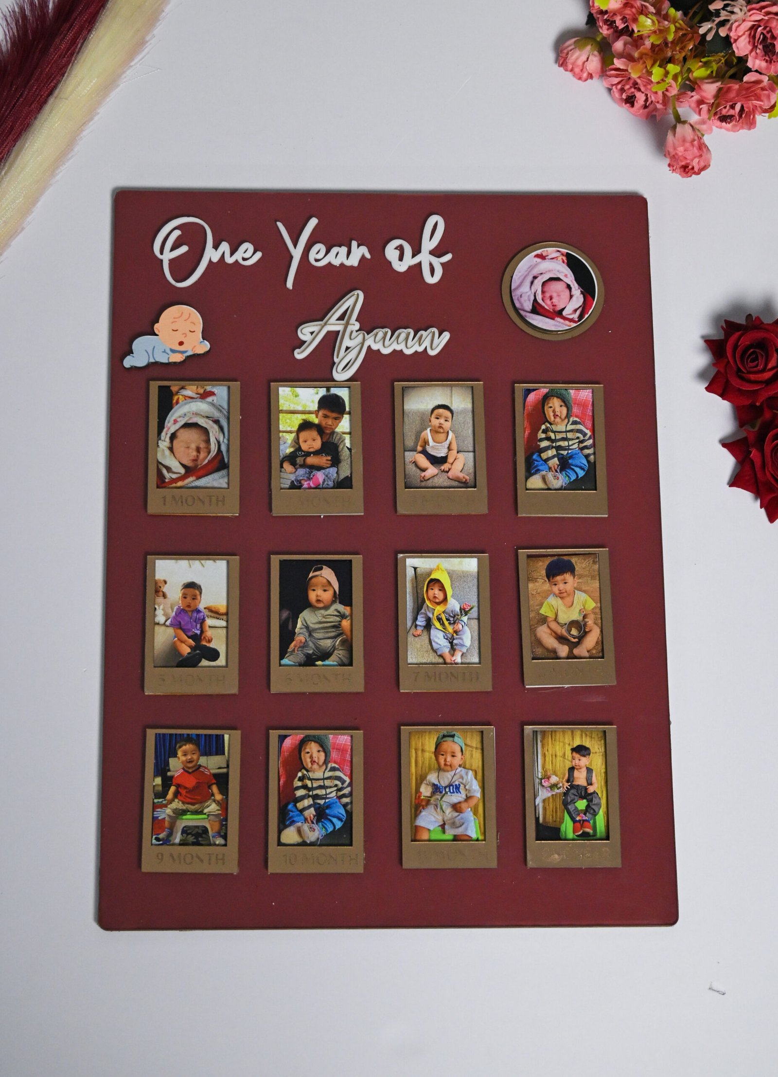 Turn your memories into a masterpiece with our Custom Acrylic Photo Frame (31 × 42 cm) – a stunning way to showcase your journey, milestones, and special moments. Whether it’s 12 months of your baby 🍼, 20 years of togetherness 💍, or a birthday celebration 🎂, this frame beautifully tells your story.
